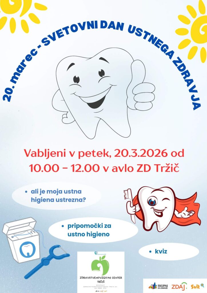 V petek, 20.3.2026, ob svetovnem dnevu ustnega zdravja bomo strokovne sodelavke iz Zdravstveno vzgojnega centra ZD Tržič za vas pripravile stojnico v avli Zdravstvenega doma Tržič. Pridite med 10:00 in 12:00 in se z nami pogovorite o pomenu ustnega zdravja, o pravilni izbiri in uporabi pripomočkov za ustno higieno, skupaj prevetrimo mite ob kvizu – kaj je res in kaj ni … VABLJENI!
